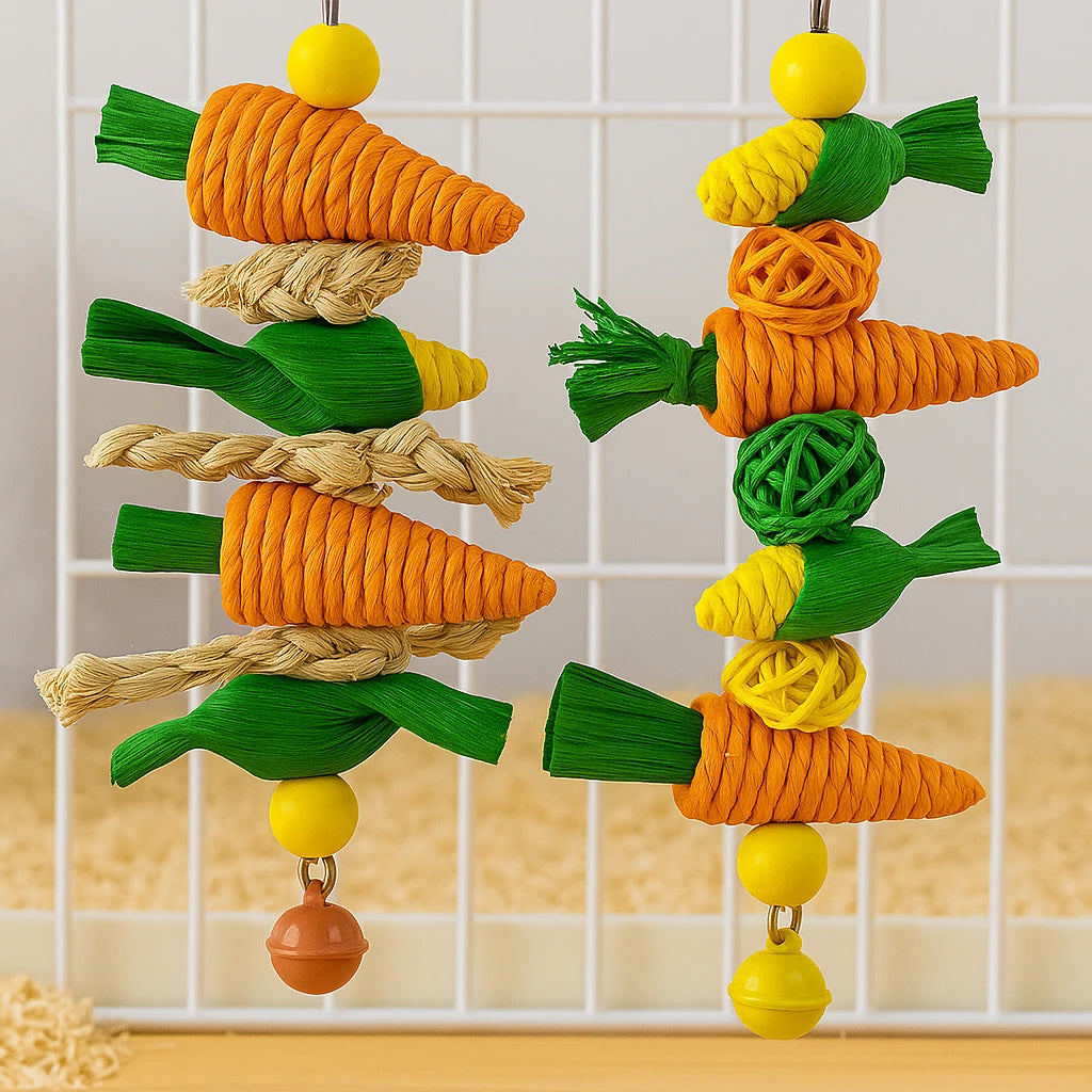 Underhåll din lilla vän med denna handgjorda tuggleksak i morots- och majsdesign! Tillverkad av naturliga material som majslöv och växtfibrer – perfekt för att främja tandhälsa och motverka tristess.