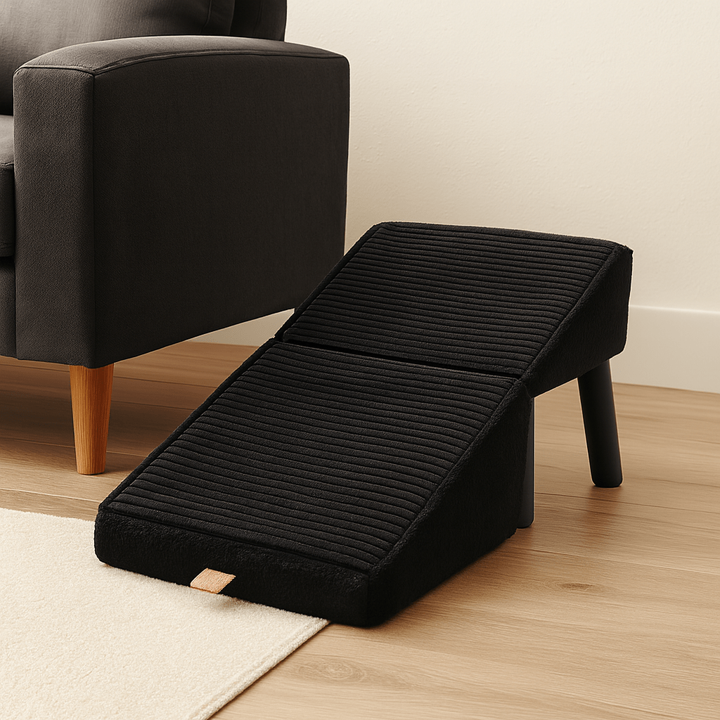 En smart och stilren lösning för små hundar och katter som behöver lite hjälp att nå upp till sängen eller soffan. Den vikbara rampen fungerar både som trappa och fotpall – perfekt i hem med modern inredning.