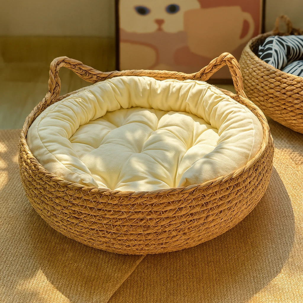 Denna handgjorda kattbädd i flätad vass är både en stilfull möbel och en trygg viloplats för din katt. Den andas naturlig design, är slitstark och kommer med en mjuk, tvättbar kudde som håller din katt varm på vintern och sval på sommaren. Perfekt för både moderna hem och kräsna katter.